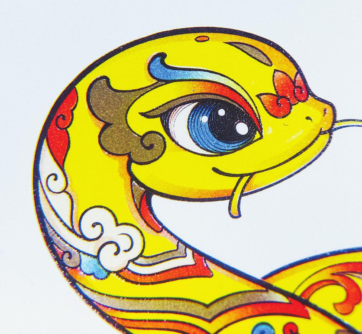 在该套邮票的工艺设计方面,北京邮票厂沿袭第四轮生肖邮票的整体工艺设计思路,采用胶雕联合印刷方式,使用六色高精度胶印以及由雕刻师采用独特的中国画白描技法配合特种棕色雕刻工艺印制。其中,在雕刻布线时使用中国画白描技法,线条的描绘准确而流畅,显著提升图案的整体精细度和艺术感。在第一枚“蛇呈丰稔”中,通过中国画白描技法的精细描绘,蛇和“嘉禾”这一形象更加醒目、突出,寓意着丰收和富足。在第二枚“福纳百祥”中,蛇身构成的“福”字通过中国画白描技法得到了更加细腻的描绘,变得更加清晰、立体,寓意着团圆和幸福。采用国际先进的激光雕刻机刻版,通过线条的粗细、深浅变化,表现出图案的层次感和立体感,使得邮票图案中的蛇身、蛇鳞以及周围的装饰元素都得到更加生动的呈现,整个画面因此更加饱满、立体。